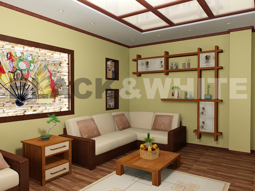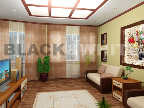 ![]() Гостиная разделена на две условных зоны. Первая - зал. Природные материалы, гармонично сочетаясь, создают мягкий, уютный и комфортный интерьер. Восточная продуманность расслабляет человека, пришедшего домой после долгого рабочего дня. ![]()