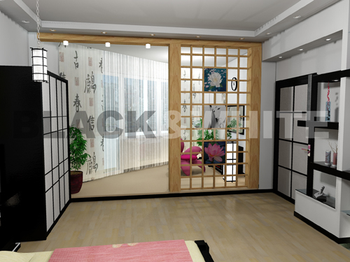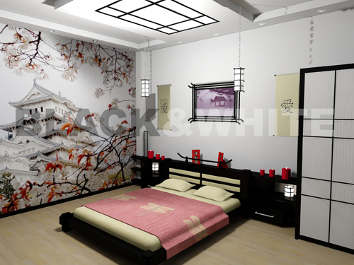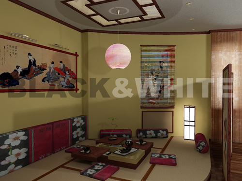 ![]() Возле стеклянного стола на стене сделали отрисовку бамбуковых стеблей. ![]() Декоративная деревянная перегородка обозначила зону будуара. В ячейках перегородки композиция из трех витражных вставок. ![]() Приятно смотреть на японский дворец и цветущую сакуру. ![]() В женской части красиво цветет "лотос" - кресло в виде цветка. ![]() В полу под нишей находится композиция из цветков и стеблей бамбука разложенных на желтом песке.   |