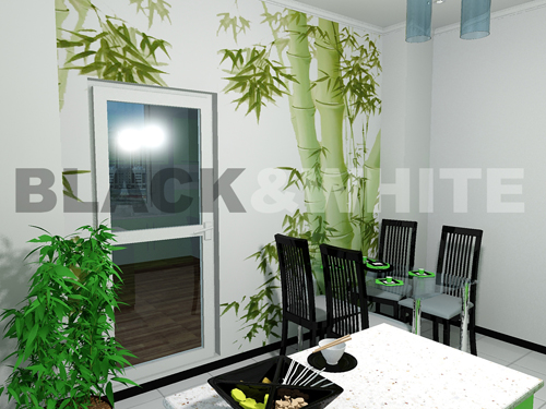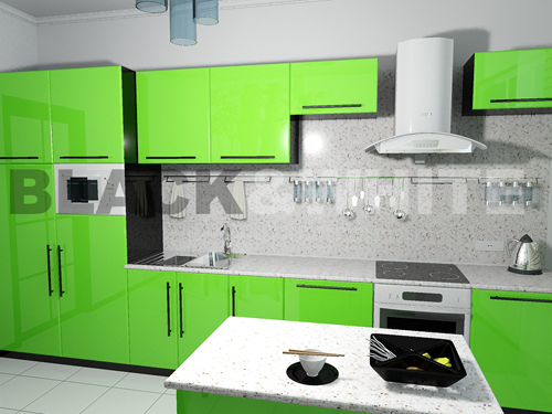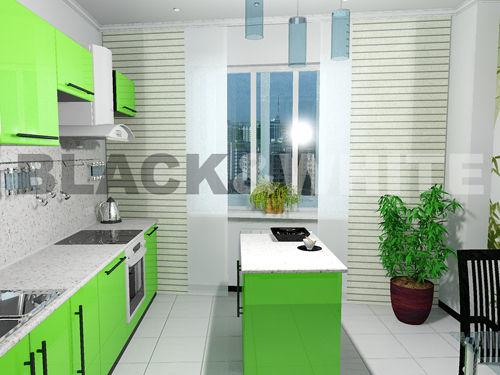 ![]() В чайной зоне устроили подиум. Традиционный японский стол, изготавливался на заказ по чертежам дизайнера. ![]() Коридор фисташкового цвета. Стены украшены холстами с традиционными восточными мотивами. ![]() Кухню было решено сделать яркого зеленого цвета. ![]()