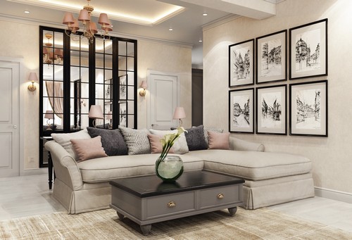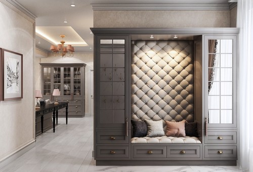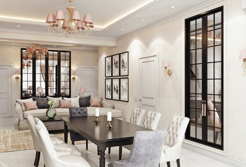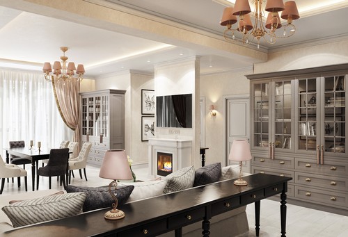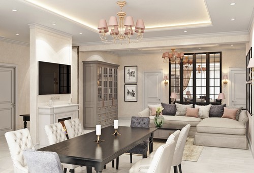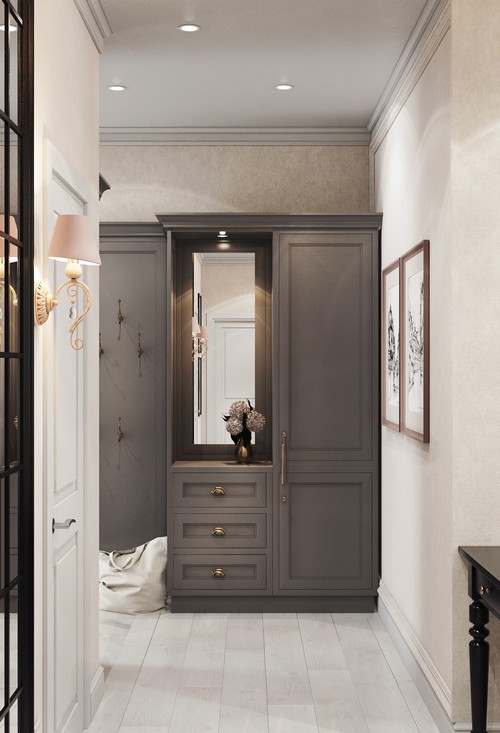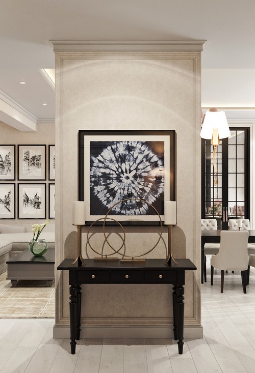 ![]() Все начинается с порога... ![]() В зоне прихожей находятся два шкафа. Центральная часть одного из шкафов выполнена в виде дивана. Спинка и сиденье оформлено каретной стяжкой. В нашей стране всегда почет и уважение пожилым людям, поэтому часто в прихожей зоне в ущерб месту хранения обустраивают место, где можно сесть и комфортнее одеть обувь или просто подождать остальных гостей. ![]() Напольное покрытие в прихожей - керамогранит. ![]() Пройдя дальше и повернув за угол мы попадаем в большое, светлое помещение, площадью около 60 квадратных метров. С задней стороны, по всей длине дивана, стоит изящная тумба на ножках, выполненная на заказ. Она отделяет пространство гостиной от прихожей зоны и выполняет декоративную функцию. ![]() Интерьер оформлен в спокойных светлых тонах. На стенах декоративная штукатурка, на полу паркетная доска. Большие зеркала в деревянных рамах антрацитового цвета дополняют этот красивый ансамбль и добавляют простора и света в дом. ![]() Возле окна находится столовая зона. Чтобы визуально скрыть двери в спальные комнаты мы добавили перегородку с телевизором и электрическим камином. ![]() В стене, возле входа в кухню, есть стеклянная перегородка. Это минимизирует камерность кухни. ![]() ![]() ![]() ![]() ![]() Кухня. Большое рабочее пространство для приготовления и ничего лишнего. Кухонный гарнитур п-образной формы выполнен таким образом, чтобы всё было под рукой. Большие шкафы пеналы находятся слева и сзади от плиты. Встраиваемый духовой шкаф и микроволновка слева. Сзади большой холодильник. А плита и раковина на одной большой столешне. ![]() Обеденное место находится возле окна. ![]()   |